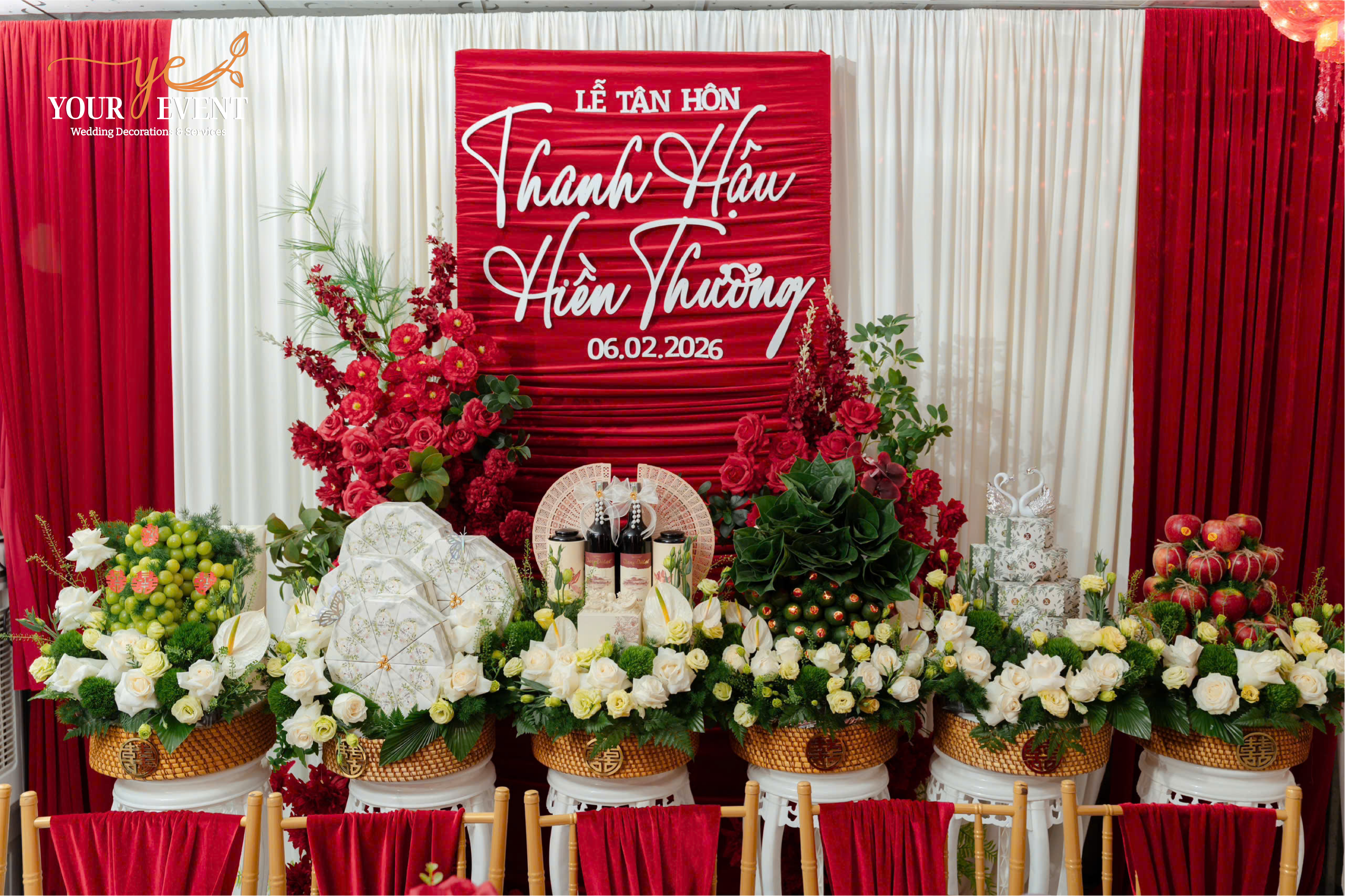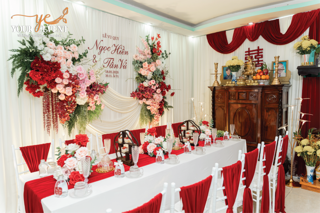 Từ bàn tay tỉ mỉ của đội ngũ thiết kế đến những concept tinh tế, Your Event mang đến không gian cưới cảm xúc – trang trọng – đậm dấu ấn cá nhân. . Dịch vụ của Your Event bao gồm trang trí gia tiên, trang trí tiệc cưới tại nhà, dịch vụ trang trí gia tiên trọn gói, trang trí tiệc cưới tại nhà hàng và những mẫu cổng hoa cưới đẹp phù hợp mọi phong cách.