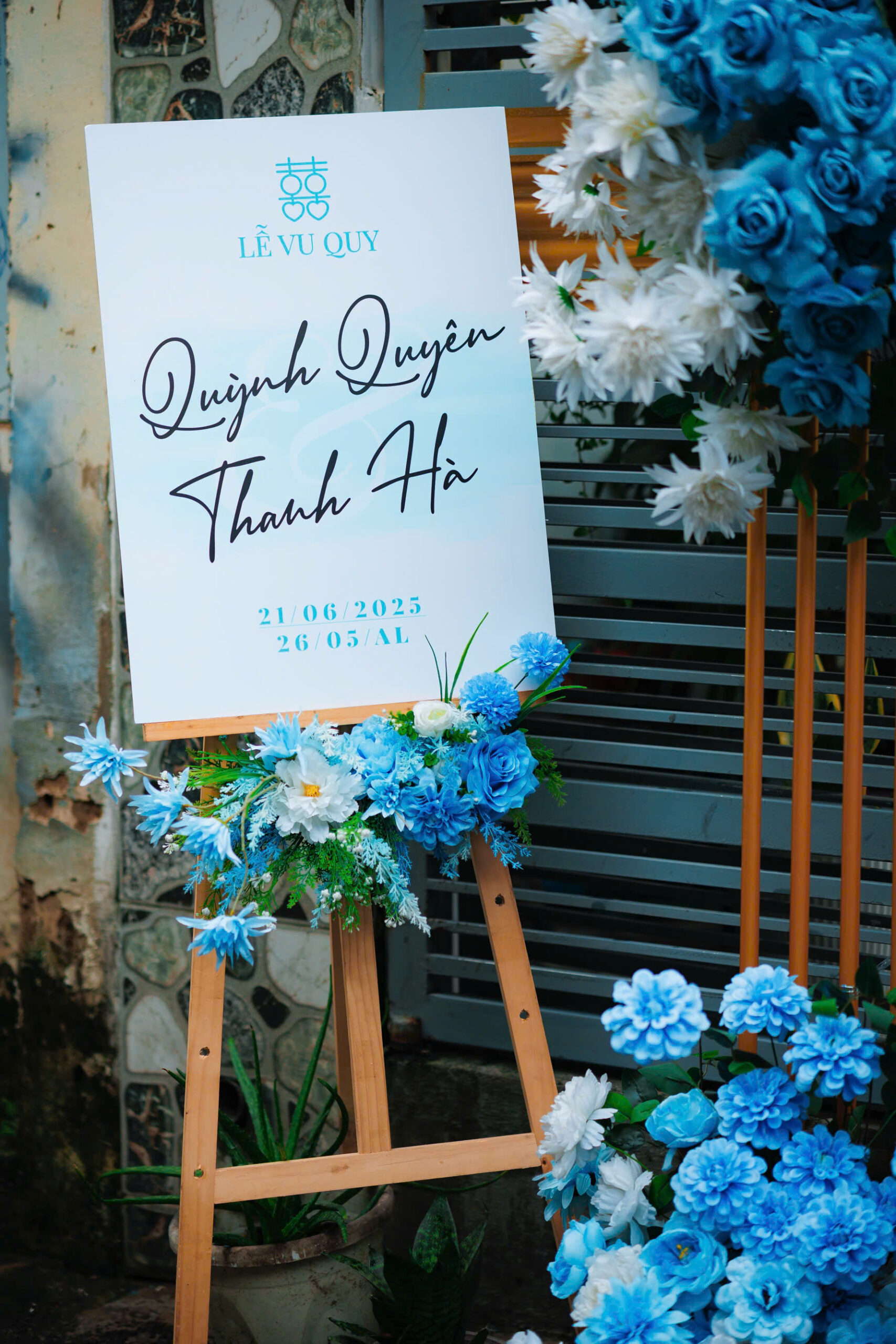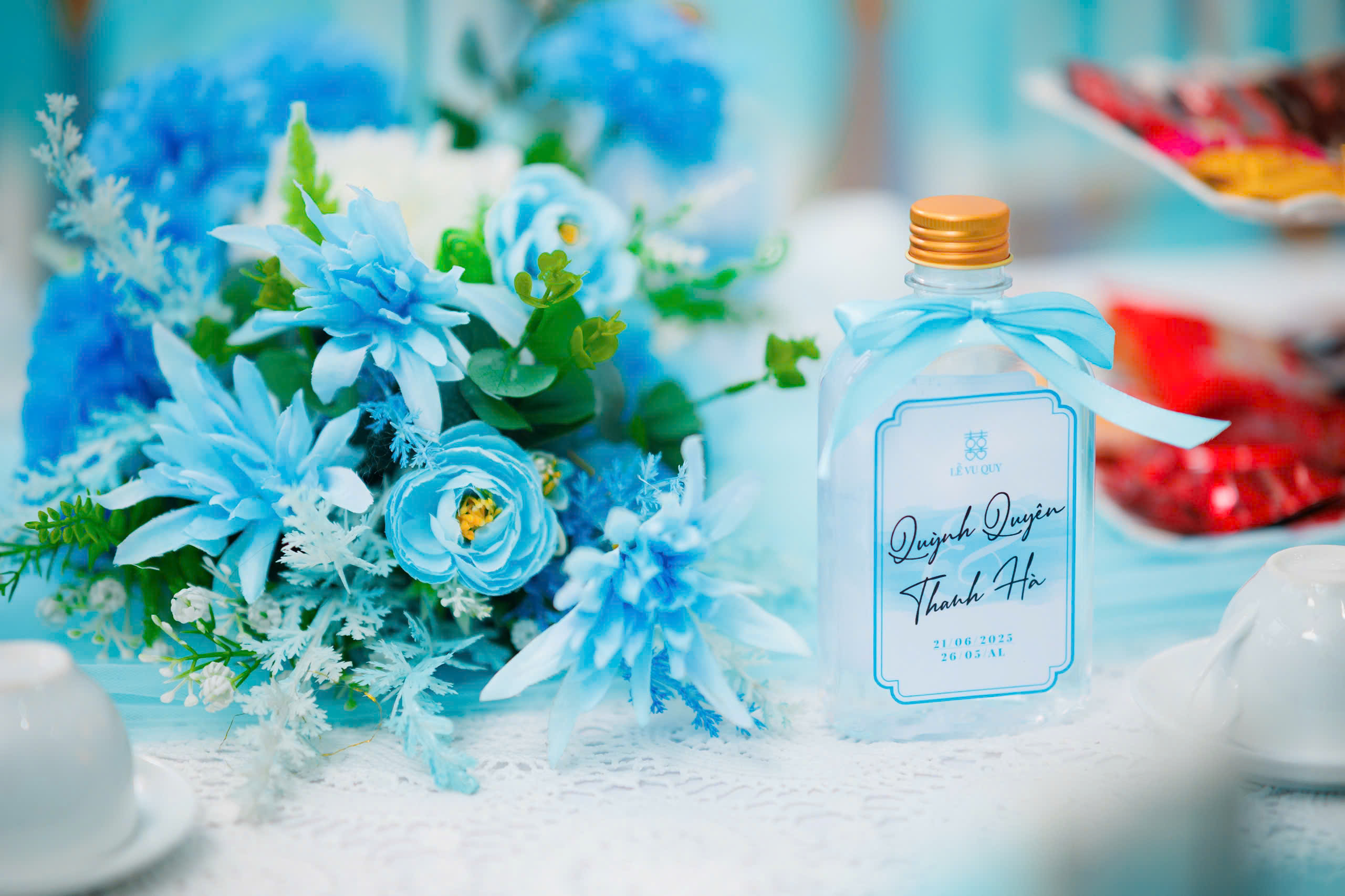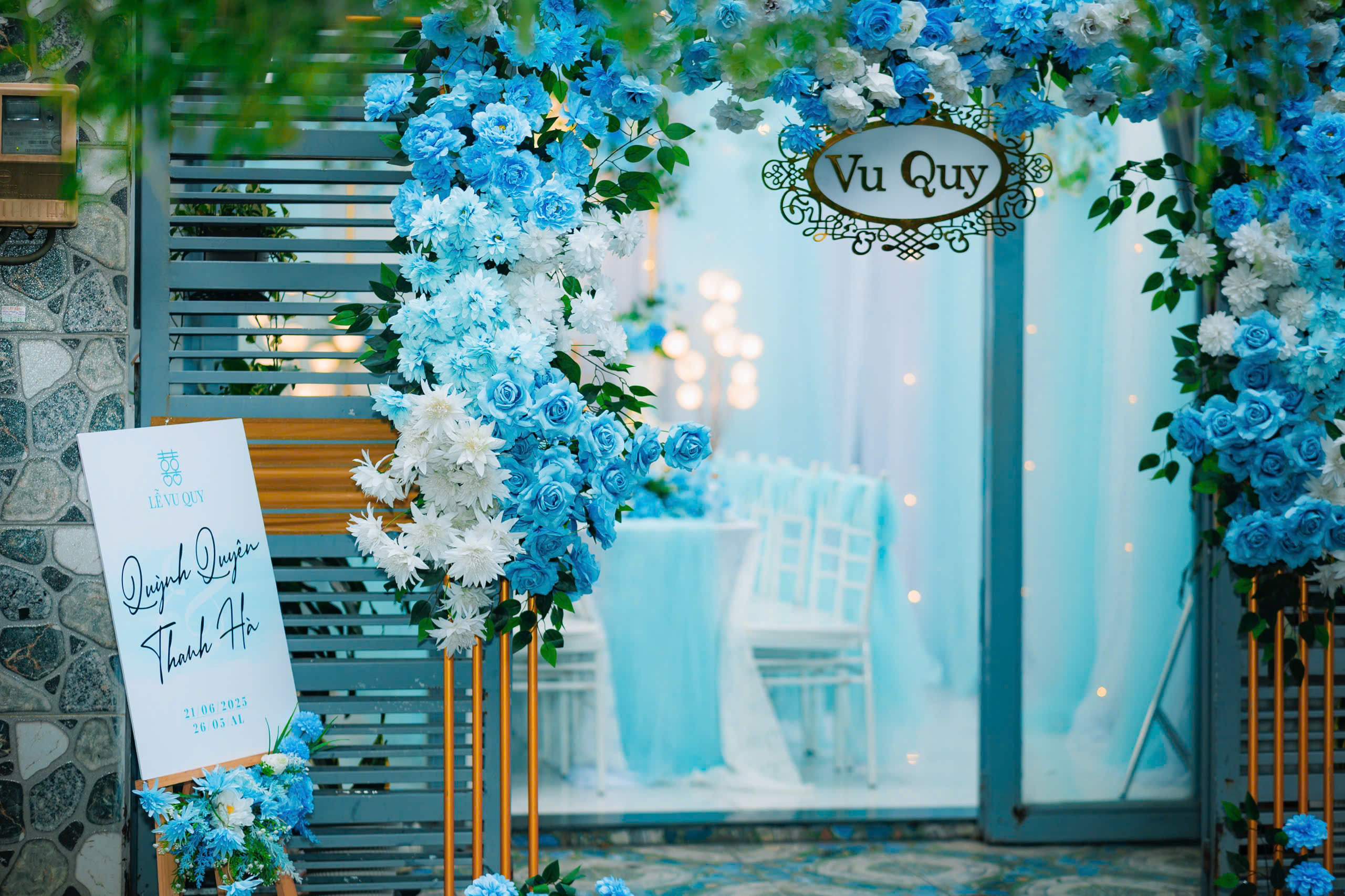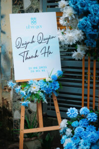 Trang trí gia tiên tone xanh dương không chỉ giúp không gian trở nên tươi mát, mà còn thể hiện sự bình yên, tin tưởng và tình yêu vững bền giữa cô dâu – chú rể.